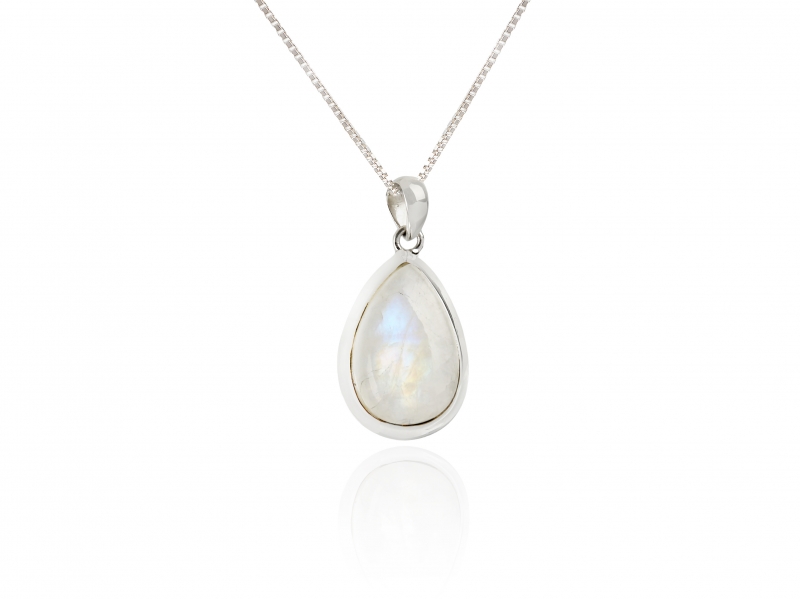 Srebrn obesek Mavrični mesečev kamen z elegantno srebrno obrobo, ki ujame odličen lesk in modrikasto mavrico spektrolita. Dve velikosti: