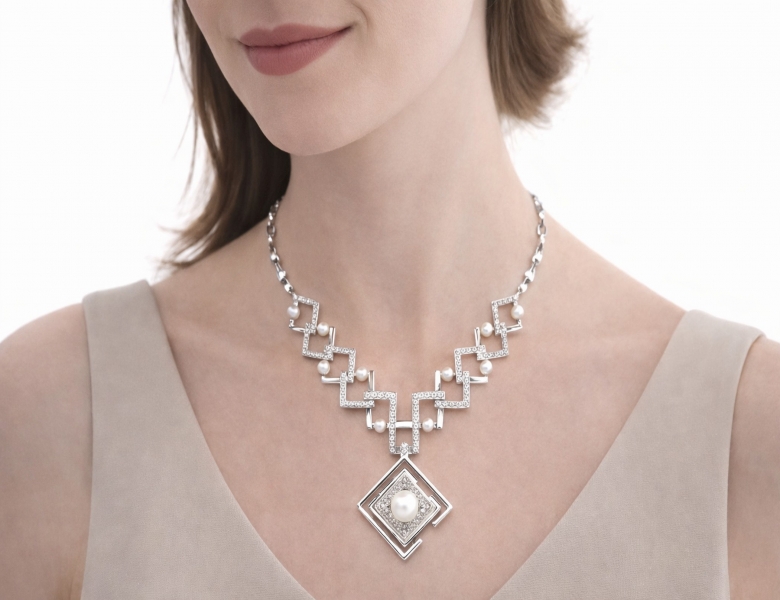 The Serpenti Silver Necklace blends sculptural elegance with the soft glow of Pearls. Crafted from rhodium-plated 925 sterling silver, its geometric design is enriched with luminous freshwater pearls (5 mm- AA quality) and shimmering zircons. The central pearl of 9 mm adds a sense of harmony, creating a timeless piece of refined luxury. Necklace length 46 cm + pendant 4 cm, total weight 45 g.