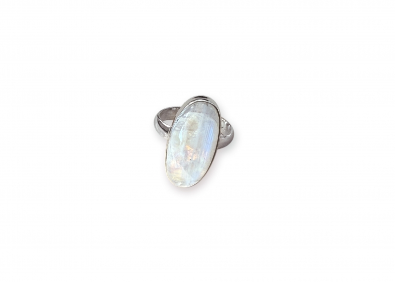 Očarljiv srebrn prstan z izstopajočim mavričnim mesečevim kamnom podolgovate ovalne oblike (velikost 10 x 20 mm do 12 x 18 mm), AA kvaliteta. Lesket z nežnimi modrikastimi odsevi prinaša čarobno mavrično igro svetlobe. Elegantna oblika z močnim vizualnim učinkom, teža prstana 5,6–6 g.