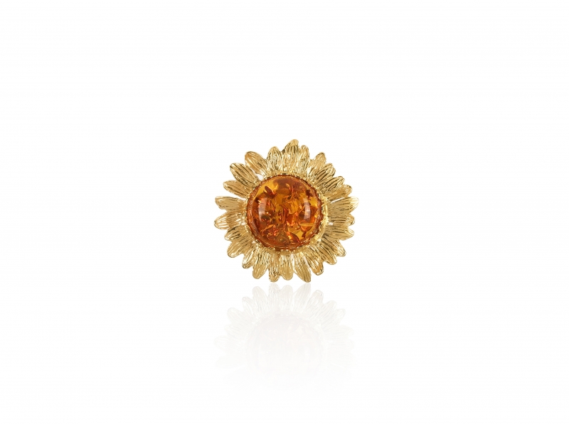 Srebrn prstan z rumenim baltskim jantarjem premera 14 mm – AA kvaliteta, obdanim z nežnimi zlatimi žarki - pozlačeno srebro 925. Premer sonca je 26 mm, teža prstana 7 g. Prilagodljiva velikost (obseg 54–60 mm) omogoča udobno nošenje. Prstan simbolizira svetlobo, optimizem in toplino – popolno darilo.