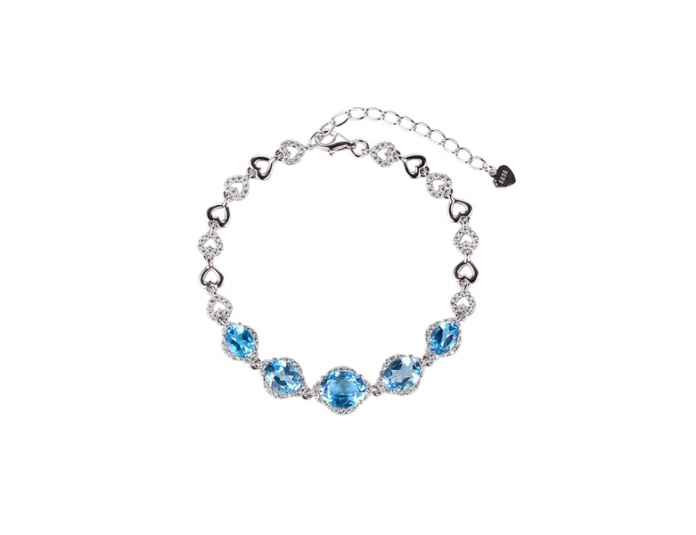Srebrna zapestnica Modri topaz s srci, ki so povezana kot členi in okrašeni s cirkoni. Skrbna draguljarska izdelava z izbranimi modrimi topazi po velikosti od 5 x 7 mm do 7 x 9 mm v sredini, teža 2,32 Ct. Dolžina zapestnice je 17 + 3 cm podljška, teža 7,4 g. Rok dobave je 09.03.2026.