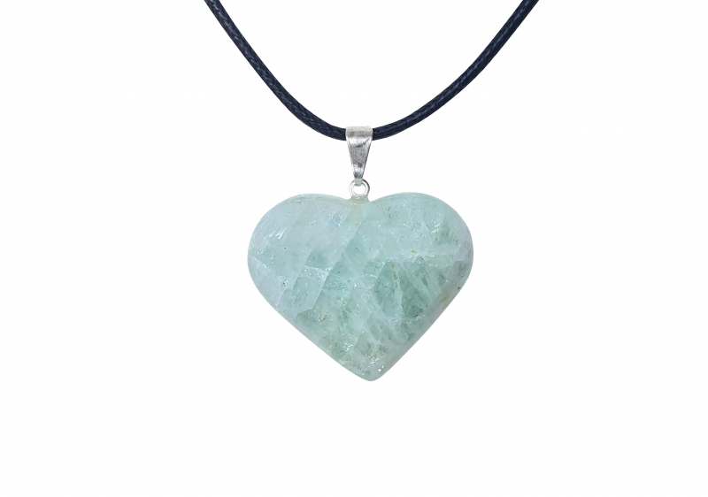 Obesek akvamarin srce velikosti 20 x 22 x 6 mm na usnjenem ali bombažnem traku dolžine 42 cm z zaponko. Na izbiro lahko tudi samo obesek.