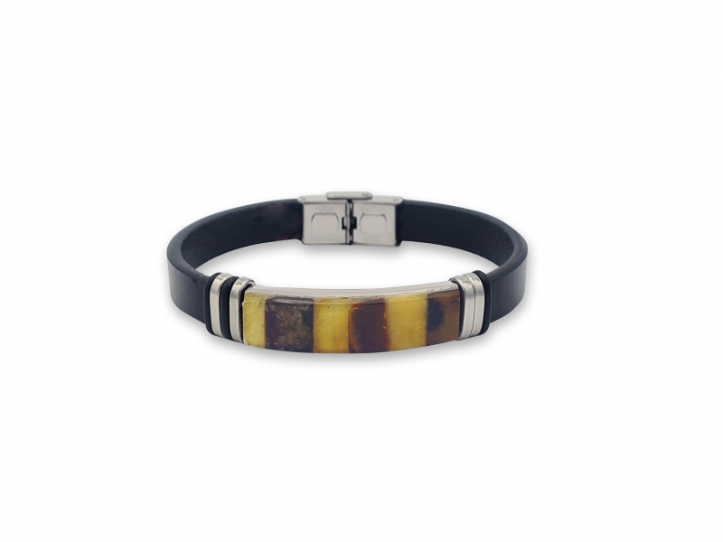 Amber Bracelet featuring rectangular pieces of Baltic Amber in honey, cherry, and green tones on Leather belt. The Amber mosaic creates a natural harmony of warmth and color. Finished with a sleek stainless steel clasp, adjustable length (18–22 cm).