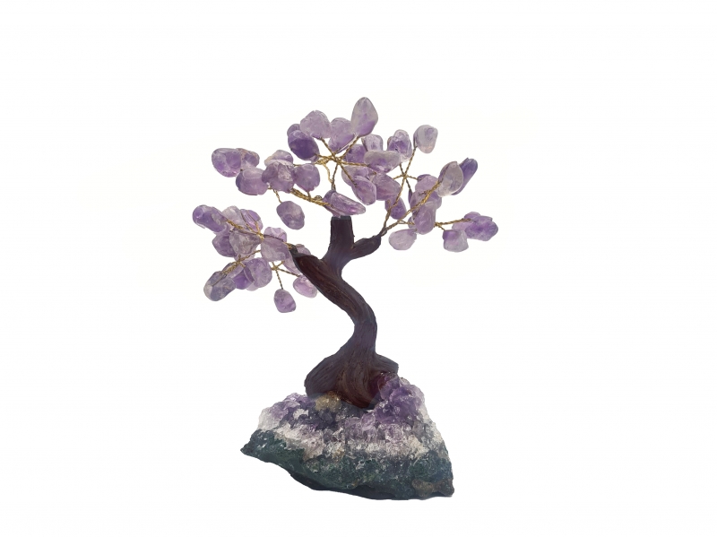Decorative Amethyst crystal tree bringing peace and harmony to any space. Each branch holds natural amethyst crystals (10 × 12 mm), set on a genuine raw amethyst base from Brazil. Every piece is handcrafted and unique in shape and shade. Available sizes and crystal varieties: 1. 100 × 80 mm, 21 Amethyst crystals; 2. 150 × 100 mm, 60 Amethyst crystals.