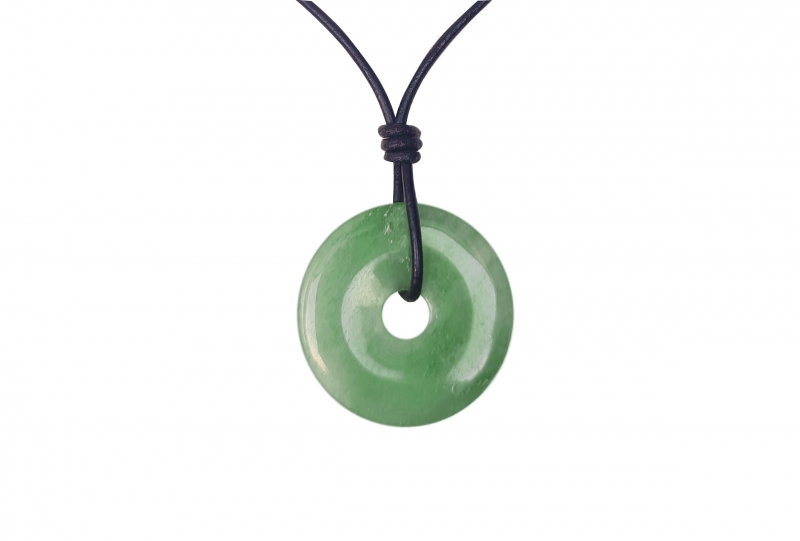 Aventurine Pendant DONUT 30 mm on a Leather or Cotton String with a patent for adjusting the length (40-80 cm). AVENTURINE calms nervous tension and harmonizes the flow of energy. Its green color affects the heart chakra and opens the door to emotions.