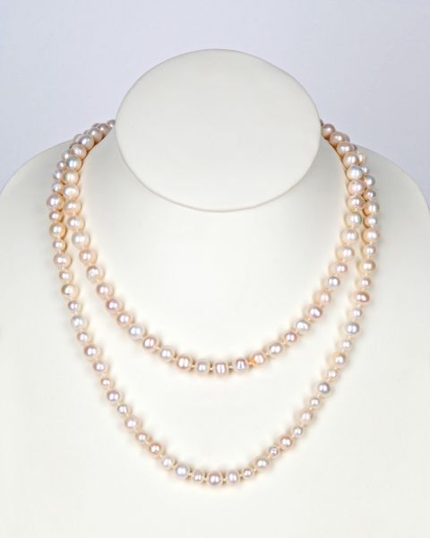 Dolga biserna ogrlica iz nežno roza, belih in mareličnih biserov (7,5 - 8,5 mm). Ogrlica - biseri so vozlani in imajo zelo lep lesk, brez površinskih nepravilnosti. Dolžina ogrlice 160 cm.