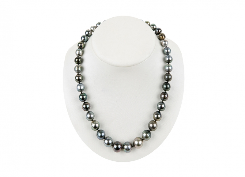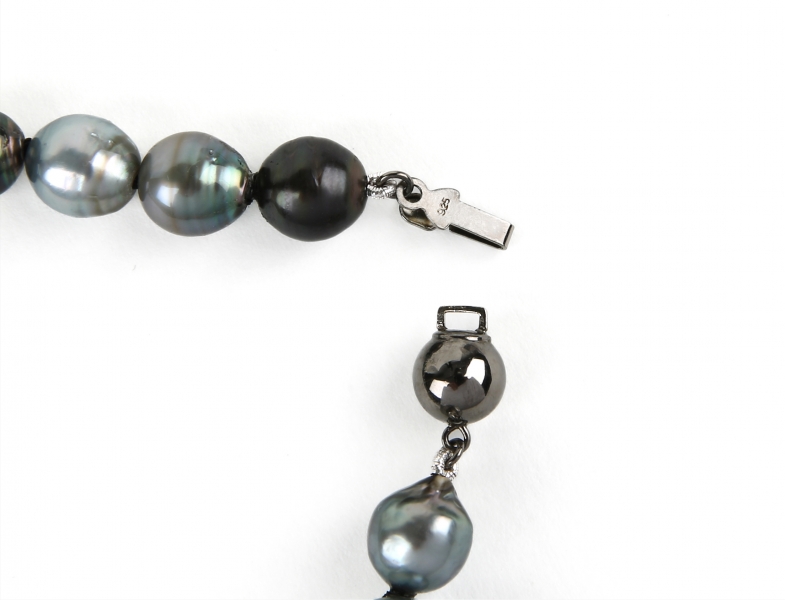 Ogrlica s Tahiti biseri velikosti 9 - 12 mm v črni in srebrno sivi barvi - dober lesk in manjše površinske nepravilnosti, AB kvaliteta. Dolžina 45 cm, teža 70 g. Izbira zaponke: