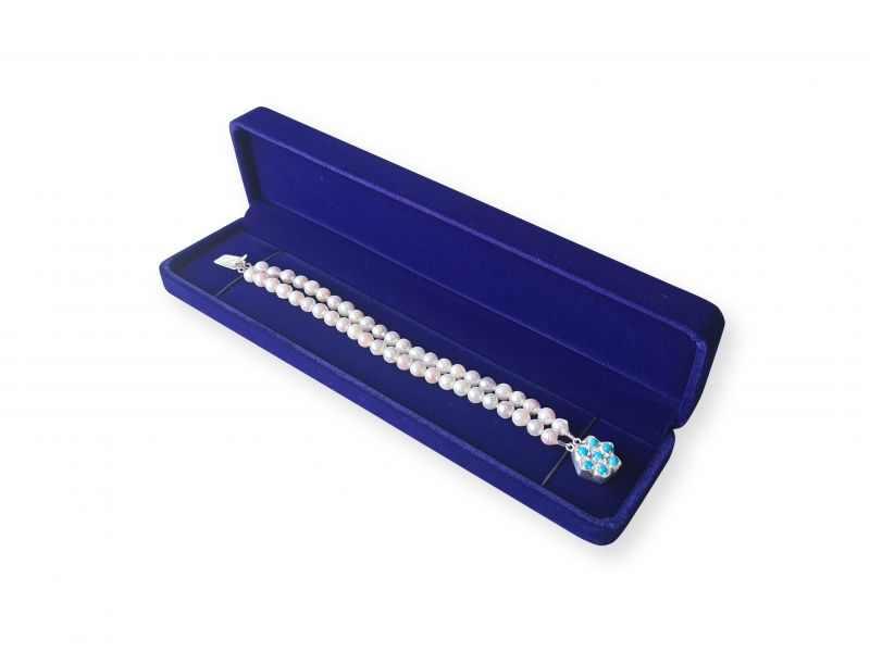 Elegantna dvoredna zapestnica z morskimi biseri Akoya in okrasno zaponko premera 17 mm z mini turkizi . Akoya beli biseri 6,5 mm, AB kvaliteta - dober lesk in manjše površinske nepravilnosti. Dolžina 18,5 in 20 cm, teža 21 g. Odlična kombinacija z ogrlico.