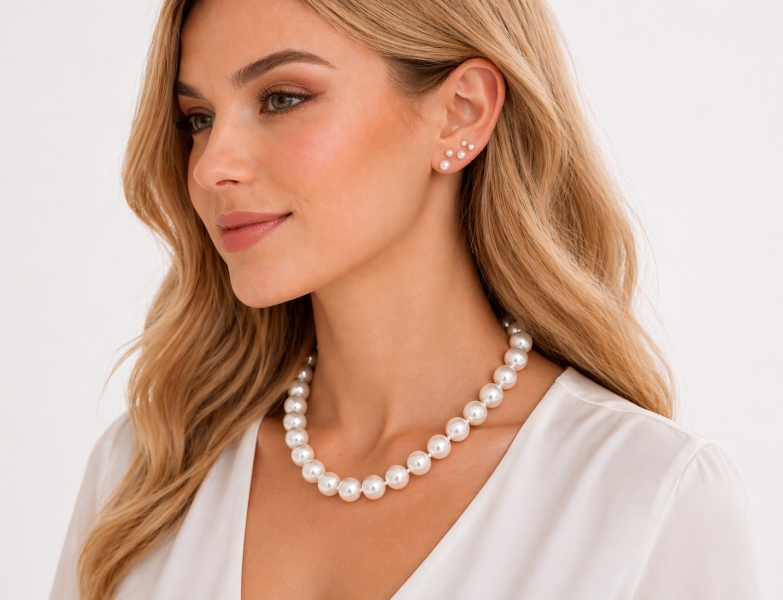 Biserna ogrlica izstopa z izbranimi snežno belimi biseri velikosti 9 mm, rahlo ovalni in izjemnega leska. Nežno vozlana struktura poudari eleganten padec, pozlačena zaponka v obliki vrtnice (12 mm) pa doda prepoznaven poudarek. Brezčasna klasika z izrazito luksuzno noto.