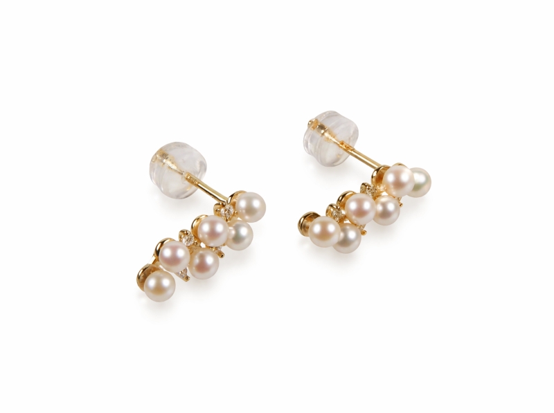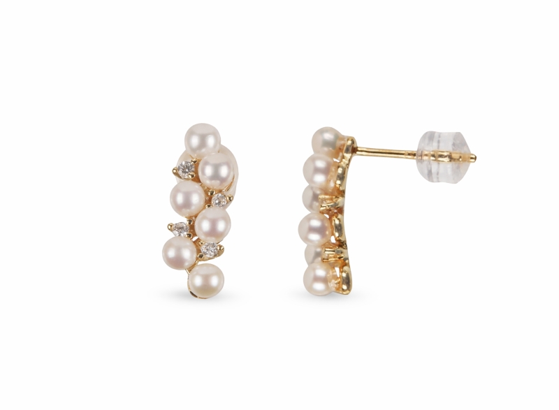 Pozlačeni biserni uhani s kompozicijo sladkovodnih biserov (4 mm), ki v nežnem loku ustvarja občutek gibanja in svetlobe. Diskretno vpeti beli safirji dodajo fin, zvezdni poudarek, ki poudari naravni sijaj biserov.