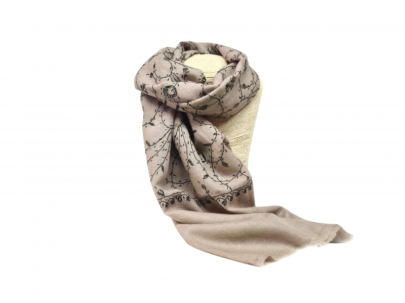 Cashmere Scarf made of soft and warm Cashmere wool. It is hand-woven with a special embroidery pattern in orange yellow and pink - Lily flowers. Size 70 x 200 cm, weight 180 g. You can choose several colors: Light brown and Beige. Made & embroidered in Kashmir (India).