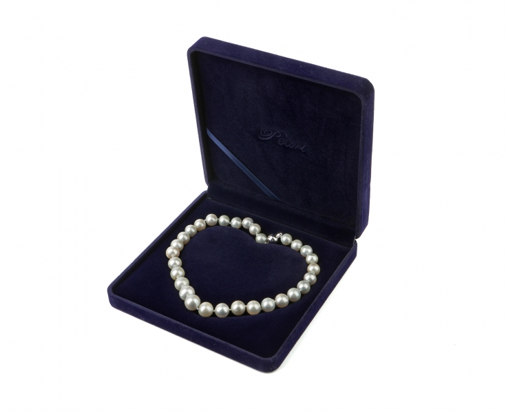 Gift box for necklaces PEARL – BLUE. Elegant presentation box designed especially for necklaces and pearl jewelry. The deep blue velvet finish gives a luxurious look and beautifully enhances the value of the gift. The box is also ideal for safe storage of jewelry after gifting. Size: 19 × 24 × 4 cm.
