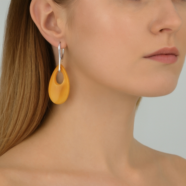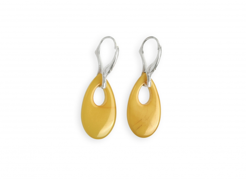 Dangling sterling Silver Earrings with honey Baltic amber - teardrop shape. Warm golden-yellow amber colour, size 14 × 25 mm, 38 mm total length, leverback closure and ultra-light weight of just 2.7 g.