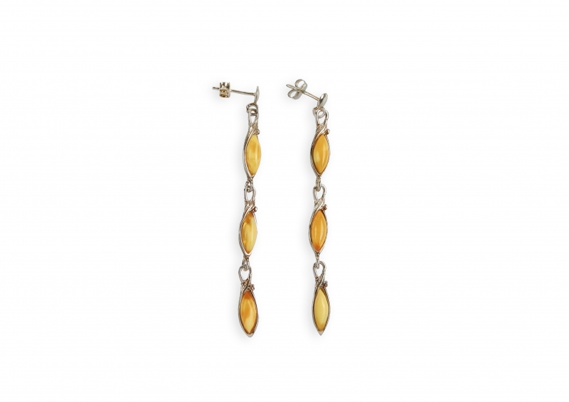 Honey Amber Earrings Markiza captivate with the warm glow of Baltic amber and refined retro elegance. The marquise-shaped amber stone (10 × 15 mm), set in delicately crafted sterling silver, creates a harmonious balance between classic aesthetics and modern lightness. Their elongated form gently enhances the facial line, length 60 mm, weight 4,8 g.