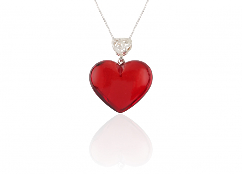 Srebrn obesek srce z baltskim jantarjem, AA kvaliteta - kristalno čist jantar v češnjevi barvi. Dve velikosti: 1) 23 x 27 x 9 mm, teža 3,2 g, 2) 28 x 31 x 10 mm, 4,1 g (srebrno obešalo).