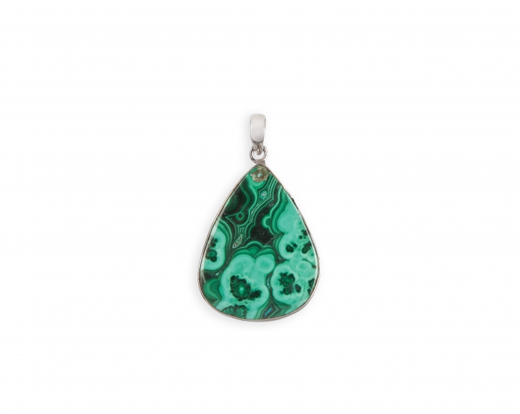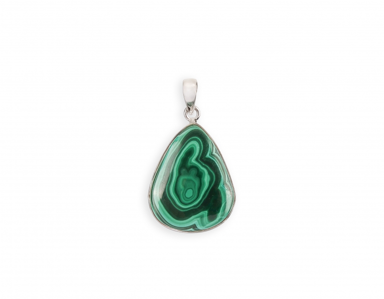Kompakten srebrn obesek z izrazito plastovitimi progami malahita, ki tvorijo hipnotične kroge in valovanja. Intenzivna zelena barva poudari moč in globino minerala ter simbolno povezuje srce z energijo Zemlje. Unikat narave - A kvaliteta, dve velikosti: 1) 30 × 40 mm, teža 11,6 g; 2) 26 × 32 mm, 14 g.