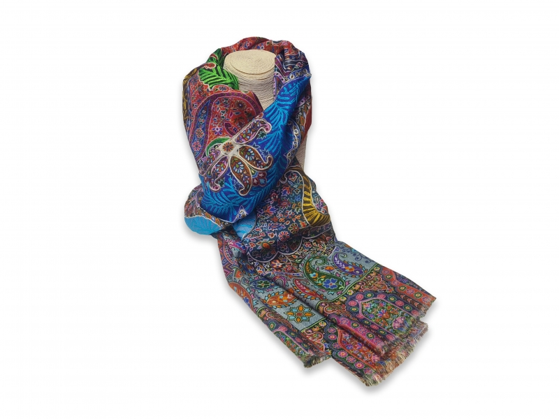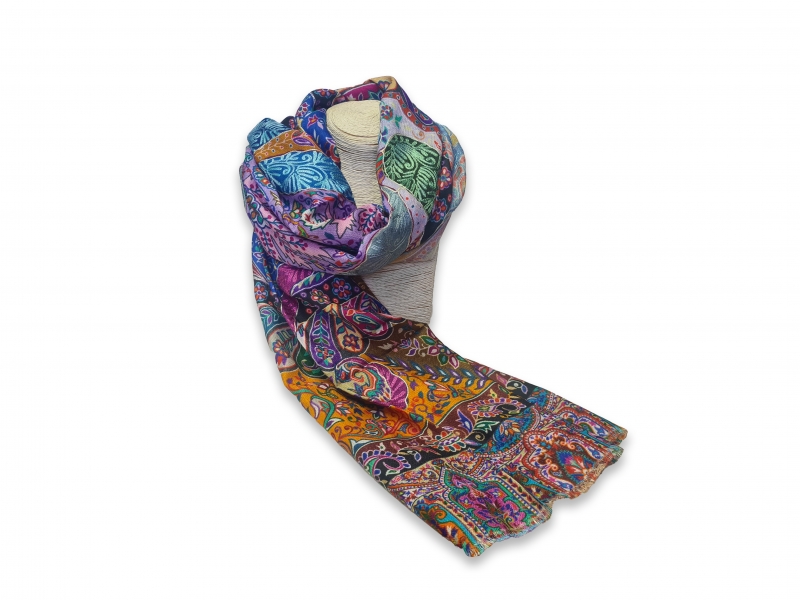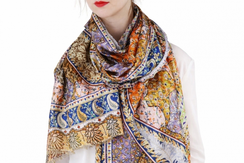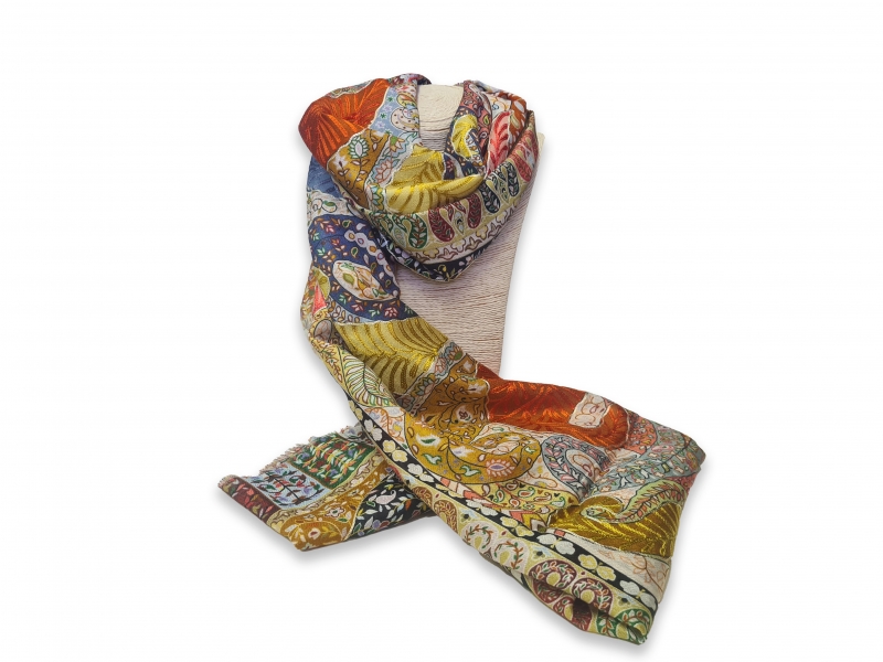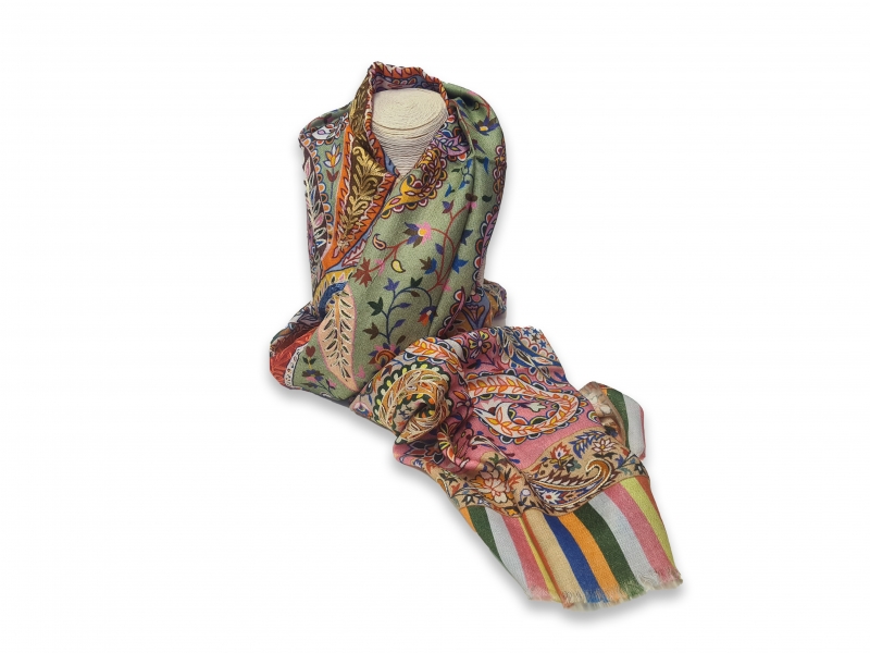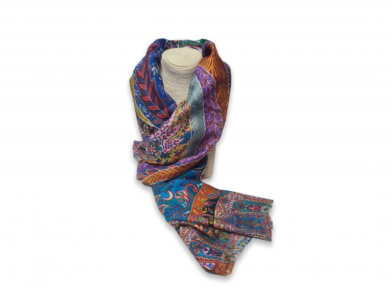 Svilen šal OASIS, ki navduši z igrivo barvno paleto in vezenimi vzorci (Jamawar) s pridihom orienta, je popoln modni dodatek za vse letne čase. Velikost 70 x 200 cm; Sestava: 90% svila, 10% modal. Barve: modra, zelena, roza, vijolična, oranžna, rumena, rdeča. Vsak šal je unikaten in se razlikuje po barvnih odtenkih in vzorcu. Izdelano v Kašmirju.