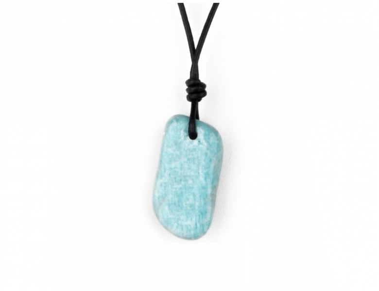 Amazonit obesek na vrvici iz usnja ali bombaža s patentom za prilagajanje dolžine od 40 do 80 cm, velikost cca. 20 x 35 mm. Amazonit je kamen upanja in resnice, prispeva k jasnosti in umirjenosti. Odganja negativno energijo, pomirja živčni sistem ter pomaga ohranjati optimalno zdravje. Uravnoteži moško in žensko energijo.
