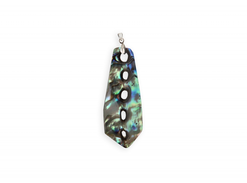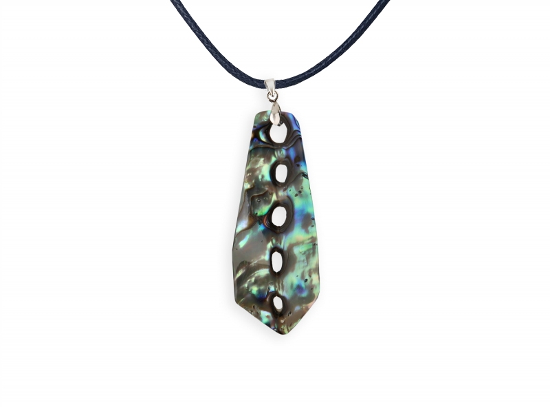 Obesek iz školjke heliotisa (Paua Shell, Abalone) 22 x 50 mm. Lahko v kompletu z bombažnim ali usnjenim trakom - dolžina 42 cm ali samo obesek
