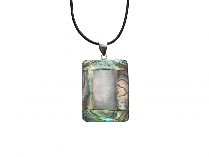 Obesek pravokotnik, zelene in bele barve iz školjke bisernice na usnjenem traku z zaponko. Dimenzije obeska 3x4 cm, trak 43 cm.