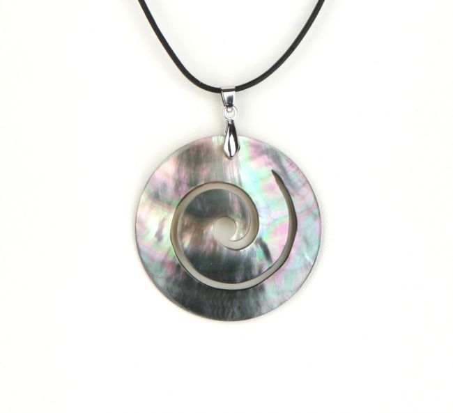 Obesek spirala sive barve iz školjke bisernice na usnjenem traku z zaponko. Premer obeska 5 cm, trak 42 cm.