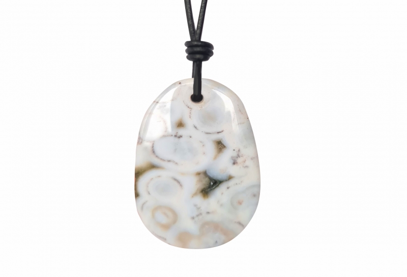Obesek iz oceanskega jaspisa - igrivi in vedno unikatni vzorci- na usnjenem ali bombažnem traku s patentom za prilagajanje dolžine (40 - 80 cm). Velikost obeska 25 x 40 mm.