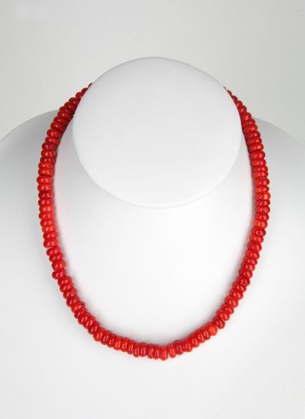 Ogrlica iz ovalnih bamboo koral velikosti 10 x 12 mm s srebrno zaponko (karabin), dolžina 43 in 50 cm.