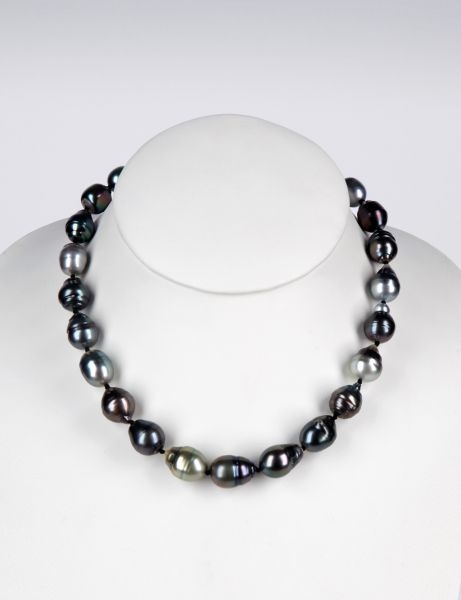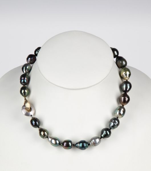 Ogrlica iz morskih baročnih TAHITI biserov v črno srebrni barvi (Peacock). Biseri so graduirani od 11-15 mm. Ogrlica je vozlana, dolžina 45 cm, teža 87 -91 g. Na izbiro: