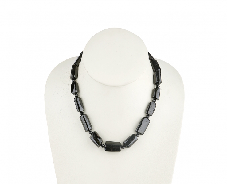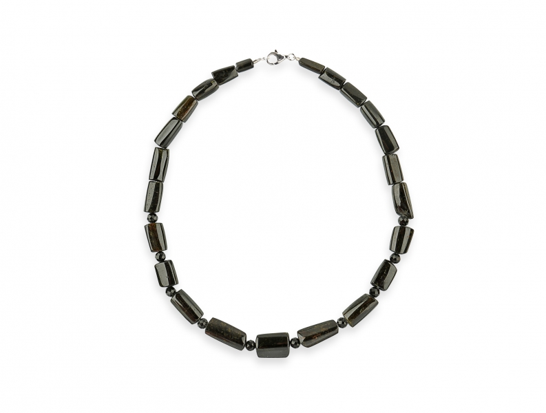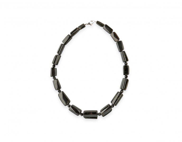 Ogrlica NATUR v kombinaciji naravnih kristalov zelenega turmalina velikosti od 10 x 18 do 12 x 25 mm, ki so samo polirani. Vmesne kroglice iz črnega turmalina. Dolžina ogrlice s srebrno zaponko je 45 cm.