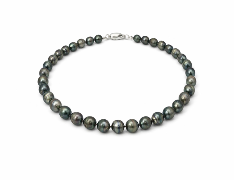 Ogrlica s Tahiti biseri 8 – 10 mm v rahlo graduirani velikosti. Baročne oblike z bogatimi odtenki in leskom ustvarjajo lahkotno igro svetlobe, površinske nepravilnosti pa poudarijo njihovo pristnost. Vozlana izvedba zagotavlja popoln padec, srebrna zaponka s patentom pa varnost in udobje pri nošenju. Dolžina 45 cm.
