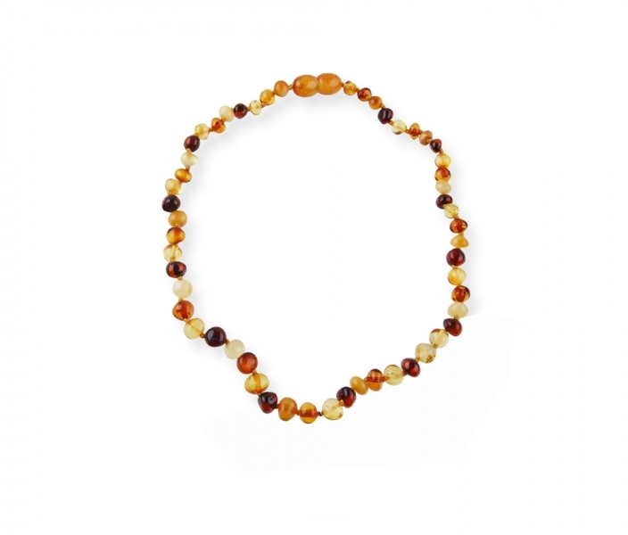 Otroška ogrlica iz kroglic jantarja velikosti 5 - 6 mm v pisanih barvah jantarja. Ogrlica je vozlana, dolžina 35 cm (pisan jantar) in 36 cm (češnjev in rumen jantar), teža 5,5 g. Jantar je fosilizirana smola iglavcev in ob stiku s telesno toploto izloča majhno količino eteričnih olj, ki blagodejno vplivajo na nemirnost ob rasti zob pri otrocih. Ni primerna za nošenje, ko otrok spi.