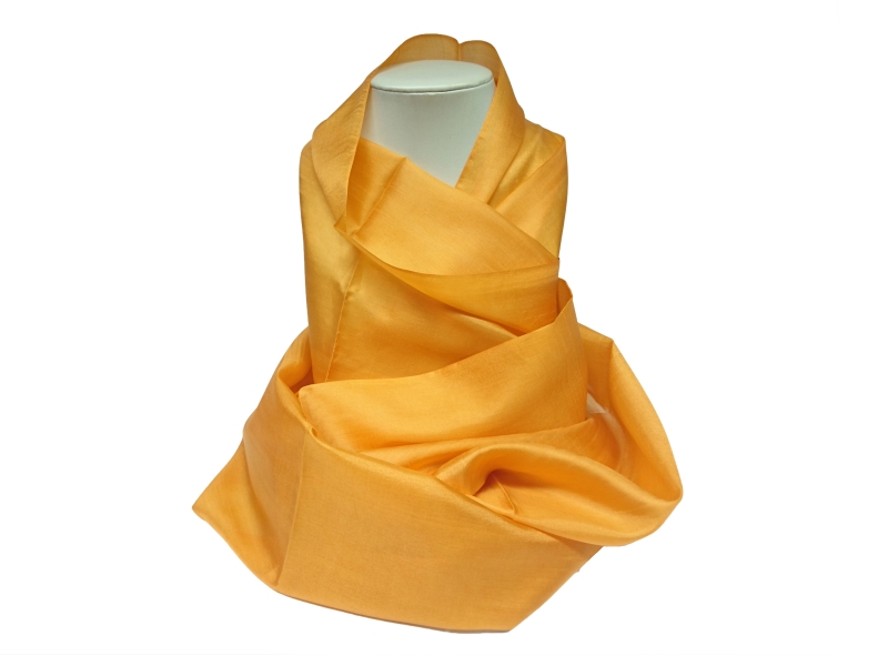 Šal COCOON iz najbolj fine kašmirske svile (100% kašmirska svila). Velikost 70 x 200 cm, topla rumena barva. Izdelano v Kašmirju (Indija). Dobavni rok je 25.11.2025.
