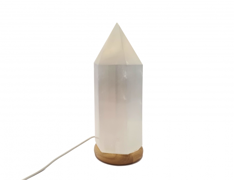 Selenite Obelisk Lamp 28 x 10 cm with wooden stand– emits a soft, calming light that fills your room with peaceful energy.