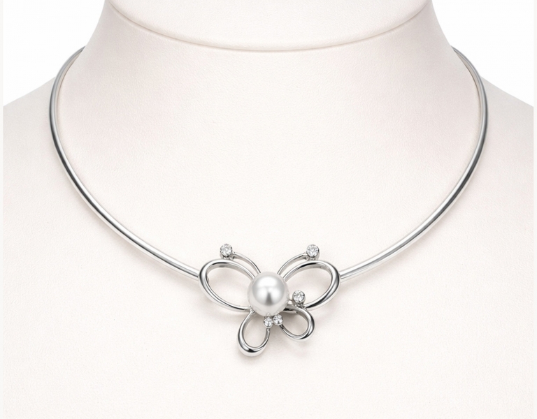 Silver Collar with round white Pearl (11 mm) and CZ. Like a quiet touch of light, Madame Butterfly rests upon the neckline — a silver butterfly with a luminous pearl at its heart, accented by delicate sparkle. A necklace that embodies lightness, refinement, and timeless grace. Length (scope) is 46 cm, weight 31,3 g.