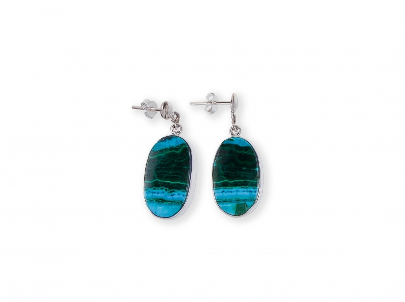 Dangling Earrings combining Chrysocolla and Malachite create a natural harmony of colors reminiscent of soft watercolor shades. Handmade earrings bring a touch of artistic expression and natural beauty. Two sizes available: 1) 14 × 24 mm (11.2 g); 2) 13 × 21 mm (12 g).