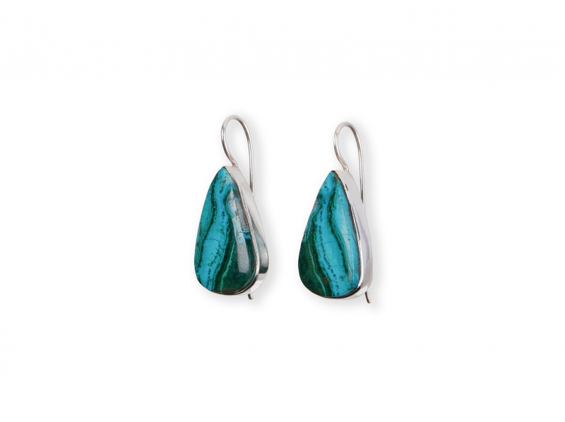 Chrysocolla Malachite Silver Earrings radiate the tranquil beauty of turquoise-blue waters and soft green reflections. Each pair is handcrafted, bringing a touch of oceanic calm and harmony to your style. Available sizes: 1) Drop 10 × 24 mm (8.1 g); 2) Teardrop 14 × 26 mm (12.4 g); 3) Teardrop 16 × 28 mm (14 g)