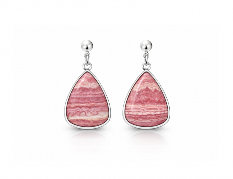 Sterling Silver Earrings in a teardrop shape 18 × 21.5 mm with natural rhodochrosite in premium AAA quality captivate with their soft pink-and-white banded structure and natural depth. Each stone pair is hand-cut and carefully set into a silver frame. Total length drop 32 mm, weight 12 g.