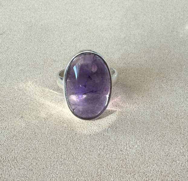 Silver Ring Amethyst Andros impresses with its simple elegance and minimalist design, highlighting the natural beauty of the gemstone. The cabochon-cut amethyst comes in size 15 x 24 mm, weight 9,2 – 10 g. Its soft purple hue and smooth surface evoke harmony and tranquility.
