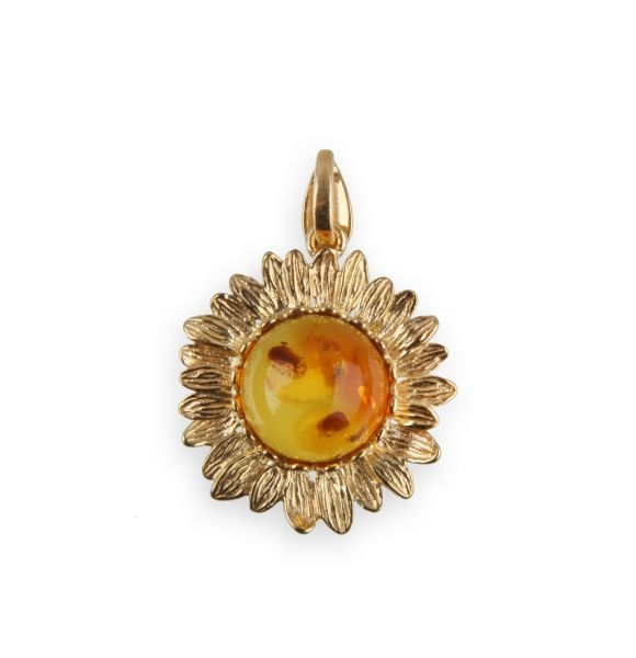 Srebrn obesek JANTAR SONCE z zlatimi žarki (pozlačeno srebro 925) in zlato rumenim jantarjem. Premer jantarja 14 mm, velikost obeska 23 x 26 x 7 mm, teža 5,30 g.