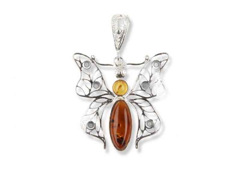 Srebrn obesek METULJ z baltskim jantarjem velikosti 35 x 48 mm, teža 5,2 g. Odlikuje ga skrbna filigramska izdelava tudi na obešalu.