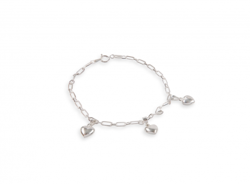 Srebrna zapestnica tri srca (charms) velikosti 7,5 x 10,3 mm. Srca - obeseke lahko poljubno prestavlajte po zapestnici. Pletenje zapestnice sidro (Anker), velikost člena 2,8 x 6,5 mm, debelina 0,8 mm. Dolžina je prilagodljiva od 16 -18 cm. Teža zapestnice 4,2 g.