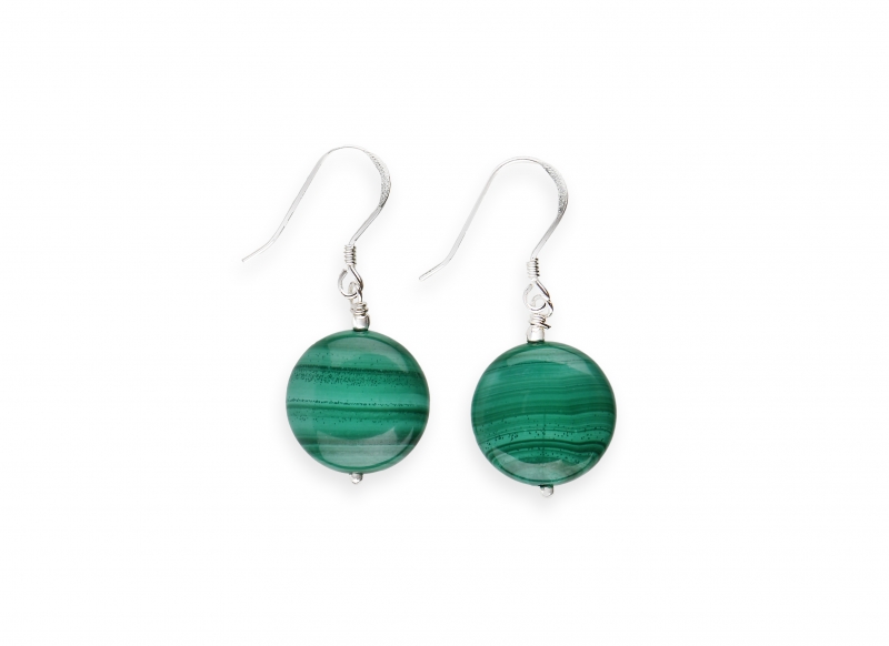 Srebrni uhani z malahitom draže premera 14 mm. Dolžina uhanov 34 mm, teža 5 g.