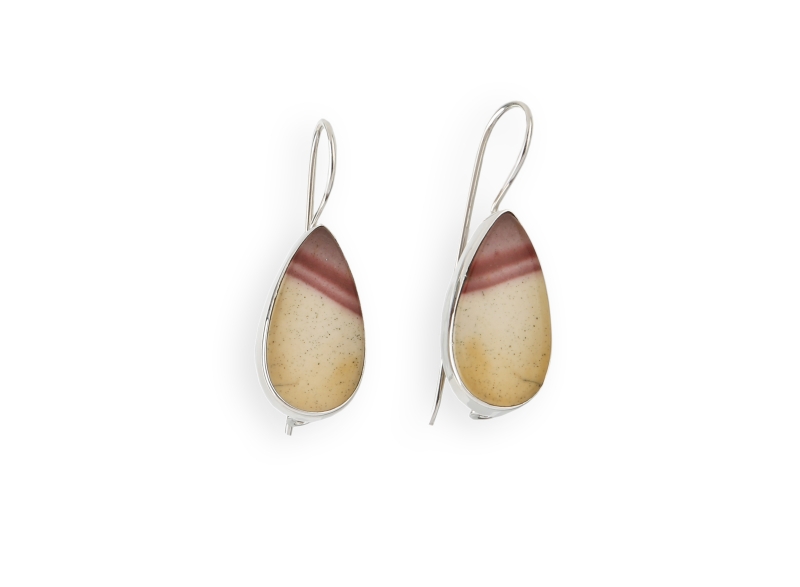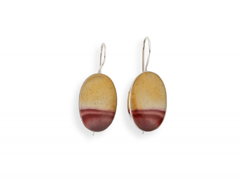 Srebrni uhani iz prvovrstnega mokaita z varnostnim zapiralom. Vsak par je simetričen par (unikat) z edinstveno kombinacijo bordo rdeče, bež in rumene barve. Izbirate lahko dve velikosti - obliki: A) 12 x 24 mm, kaplja; B) 15 x 25 mm, oval. Dolžina od 37 - 40 mm, teža 7,5 - 9 g. Lahko v kompletu s prstanom Sunset.