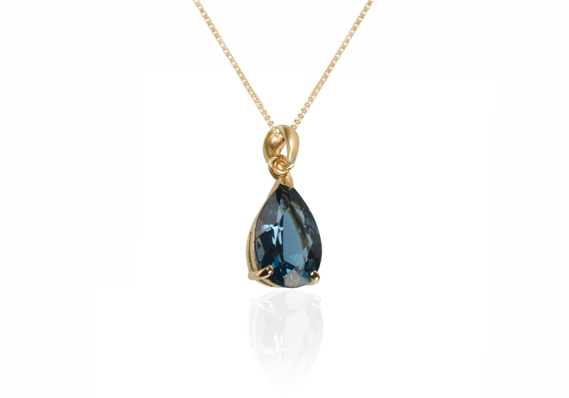 Prefinjen obesek z globoko modrim topazom London Blue 8 x 12 mm (2,60 karata), v elegantni kaplji poudarja brezčasno lepoto in razkošje. Intenziven modri sijaj se prefinjeno prepleta s toplino pozlačenega srebra, kar ustvarja popolno ravnovesje med eleganco in sodobnim stilom. London Blue topaz AAA kvalitete, skrbno brušen za maksimalen odboj svetlobe, očara s svojo globino in čistino.