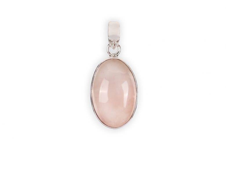 Ovalni obesek iz rožnatega kremena, ki nežno poudari naravni lesk kamna. Poreklo Madagaskar, odlična kvaliteta. Velikost roževca 16 × 23 mm - velikost obeska 17 × 25 mm, teža 8,3 g.