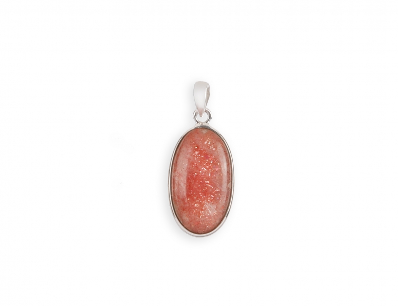 Srebrn obesek Sončev kamen v minimalni srebrni obrobi. Oranžno-rjavi kamen z naravnim svetlečim leskom simbolizira vitalnost, jasnost misli in notranjo moč. Povezan je s solarnim pleksusom, krepi samozavest ter pomaga zmanjševati napetost in strah. Na izbiro dve velikosti: 1) 17 x 29 mm, teža 6 g; 2) 24 x 36 mm, 8.8 g
