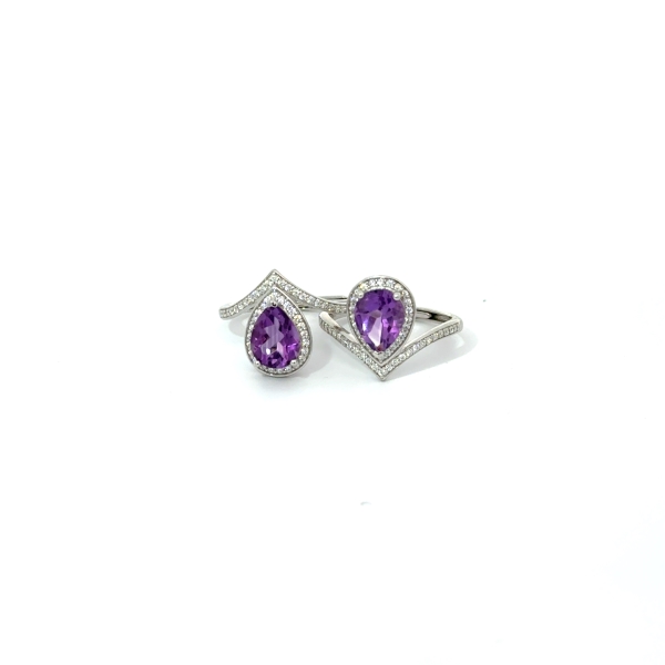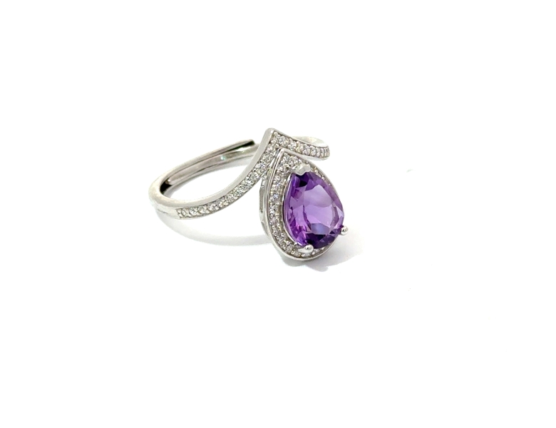 Srebrn prstan z ametistom AA kvalitete v obliki solze (7 × 10 mm), ki očara z globoko vijolično barvo. Linijo prstana dopolnjujejo mikro vstavljeni cirkoni (1,3 mm, 49 cirkonov), ki ustvarjajo eleganten sijaj. Rodinirana površina zagotavlja visok lesk in obstojnost. Prstan je prilagodljive velikosti (+/− 5 mm) in udoben za vsakodnevno nošenje.Teža 3,4 g.