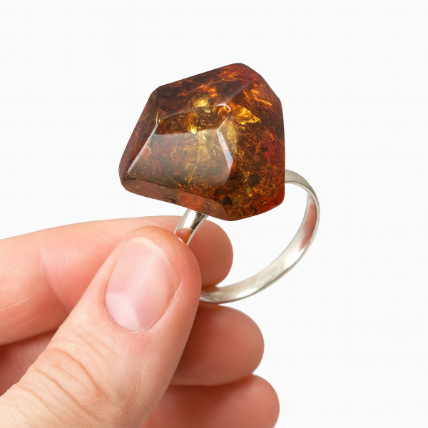Unikaten srebrn prstan z baltskim jantarjem 21 × 27 mm v globokih zeleno-rjavih tonih. Markantna poligonalna oblika z večjimi fasetami ujame svetlobo in razkrije notranji odsev v zlato-zelenih odtenkih. Prstan deluje sodobno, močno in hkrati naravno – kot ujetnik gozda v srebru. Velikost prstana je prilagodljiva od 56 do 61, teža 7 g