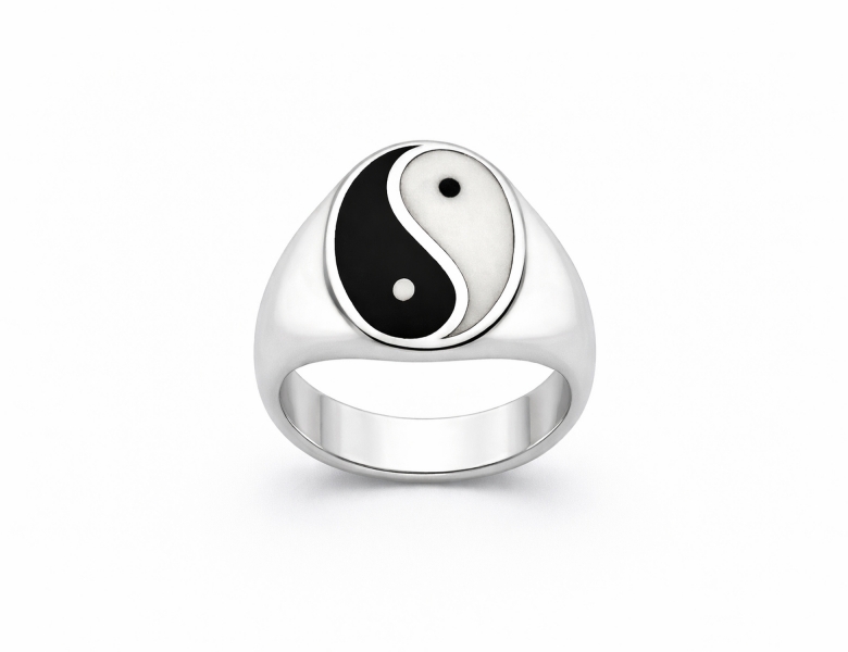 Srebrni prstan s simbolom Yin-yang predstavlja ravnovesje, harmonijo in povezanost nasprotij. Elegantno oblikovan motiv z biserno matico in oniksom velikosti 12 × 14 mm daje prstanu sodoben, a hkrati brezčasen značaj. Teža 4 g. Lahko v kompletu z uhani.
