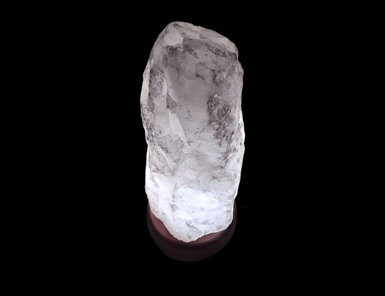 Svetilka iz kristala kamene strele velikosti 30 × 10 cm oddaja čisto, jasno svetlobo, ki poživlja prostor in čisti energijo. Postavljena je na lesen podstavek, kar poudari naravno lepoto kamna. V kompletu je električni kabel dolžine 1,5 m, stikalo in ustrezna žarnica.